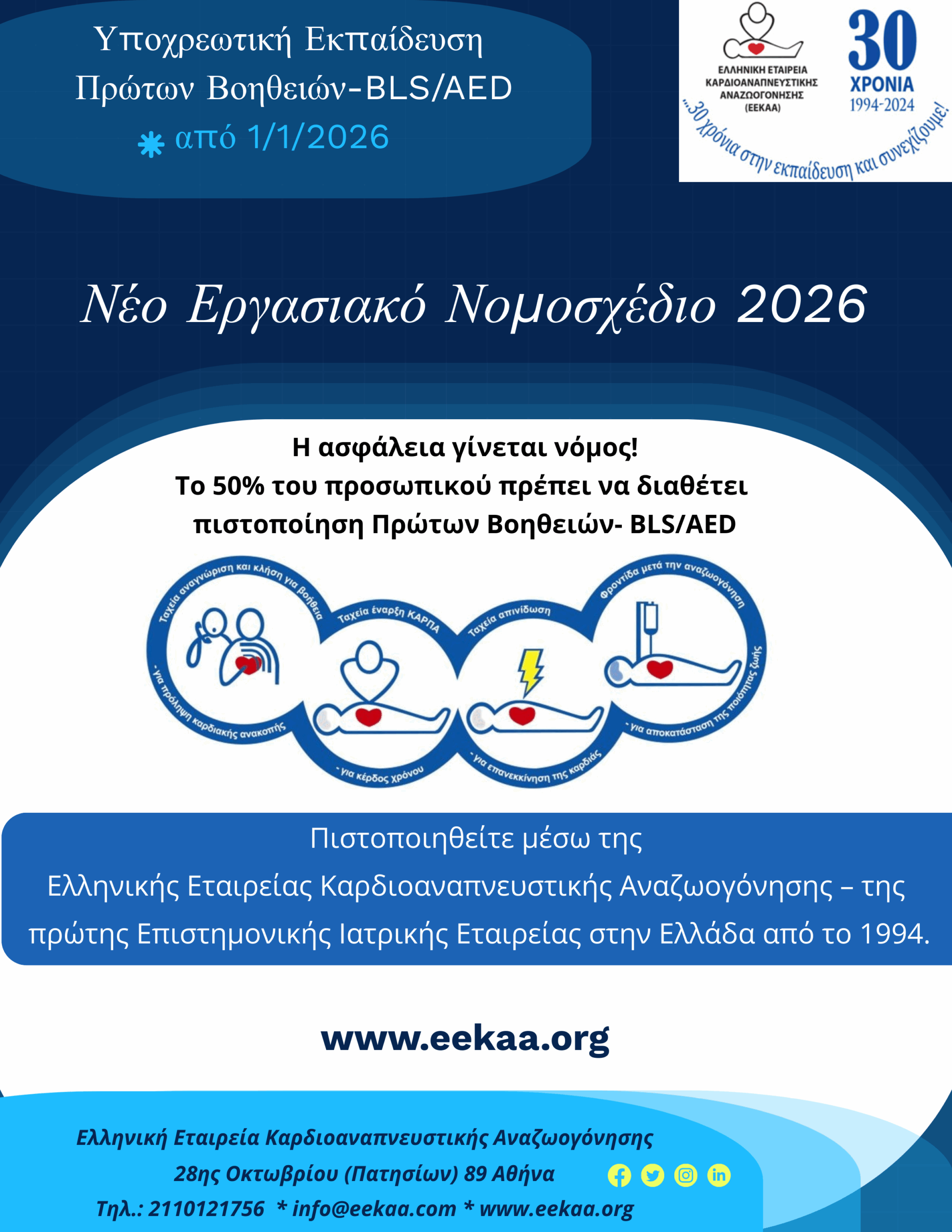 Από 1η Ιανουαρίου 2026, η εκπαίδευση Πρώτων Βοηθειών γίνεται υποχρεωτική σύμφωνα με το Ν. 5239/2025 – Άρθρο 39 & Άρθρο 535 Κ.Ε.Δ. Συγκεκριμένα, το Άρθρο 39 του νόμου καθιστά υποχρεωτική την εκπαίδευση των εργαζομένων σε: